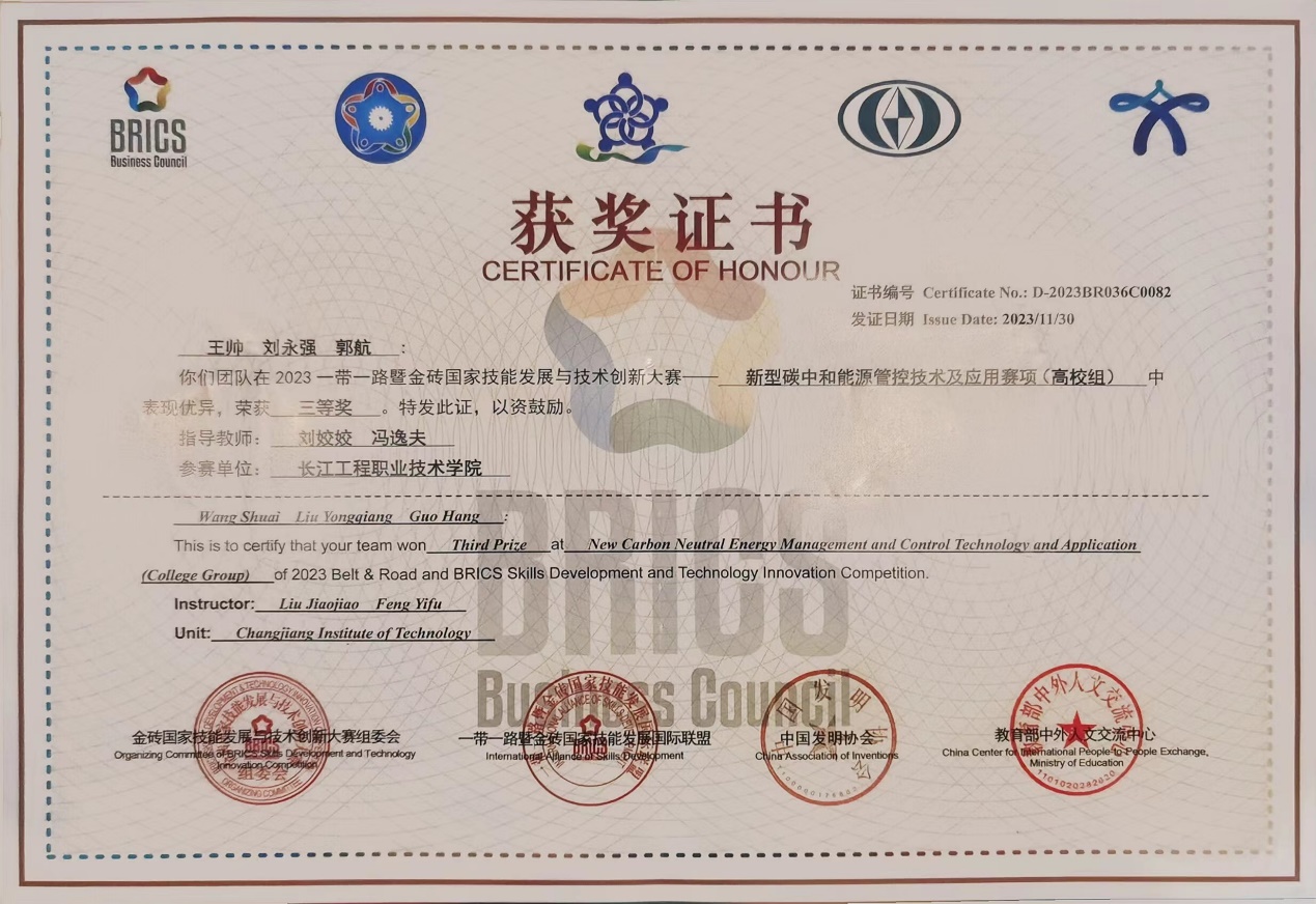 获“一带一路”金砖国家技能发展与技术创新大赛-新型碳中和能源管控技术及应用赛项三等奖