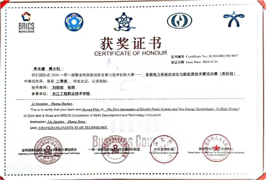 获“一带一路”金砖国家技能发展与技术创新大赛-电力系统自动化与新能源技术赛项二等奖